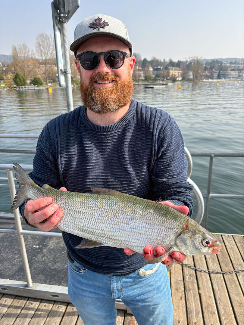 Roger Steinicke aus Zürich fischte am 7. März vom Ufer aus auf Felchen. Mit der Zürisee-Hegene am Felchenzapfen war er an diesem schönen, windstillen Tag erfolgreich.
