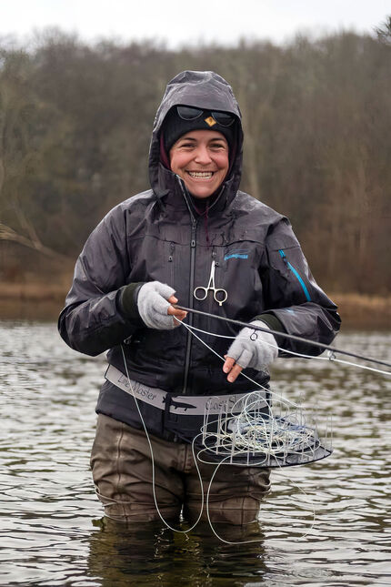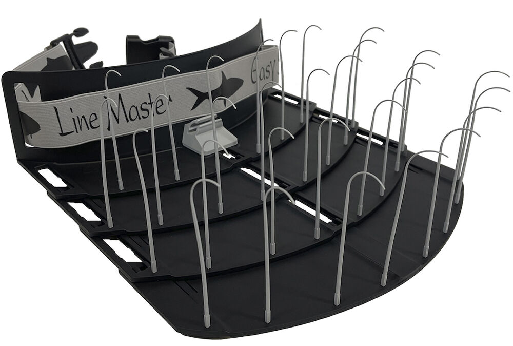 Zudem bietet der Line Master 26 flexible und ca.10 cm lange Spikes, die leicht nach vorne gebogen sind. Die Vorteile dieser Variante sind zum einen eine saubere Ordnung der Fliegenschnur auf dem Schnurkorb, sodass sich keine Knoten bilden, während die Schnur abgeschossen wird. Zum anderen bietet die Form der Spikes einen besseren Halt der gelagerten Schnur bei Wind und Welle. Selbst beim tiefen Waten im Wasser wird die Schnur nicht durch den Auftrieb davongetragen, sondern sicher zwischen den Spikes gehalten. Beide Merkmale sorgen dafür, dass die Schnur sauber gelagert wird, um stets maximale Wurfweiten zu erzielen. Ein weiteres geniales Feature ist der Rutenhalter mit integriertem Magneten, der sich auf der Bodenplatte befindet. Egal, ob beim Wechseln der Fliege oder beim Freilassen des Fisches, der Rutenhalter, in dem die Rute eingeklemmt werden kann, sorgt stets dafür, dass beide Hände frei sind. Der Magnet ist eine zusätzliche Hilfe beim Wechseln der Fliege, da er deine Muster vor dem Herunterfallen sichert, selbst bei viel Wind. Sicher gehalten wird auch Line Maszer durch einen elastischen Gürtel, der den Schnurkorb trägt und sich stets perfekt an deine Körpermaße anpasst, sodass dieser nicht verrutschen kann. Geschlossen wird der Gürtel über eine große, robuste Schnalle mit einem Schnellverschluss.