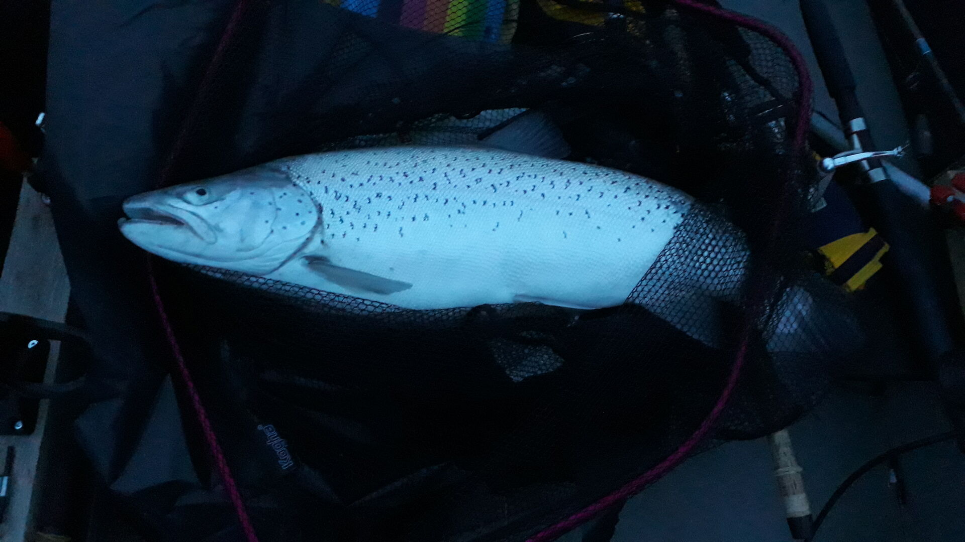 Am 27. Dezember schleppte ich auf dem Zürcher Obersee den Nachmittag lang. Ausser Ästen und treibendes Kraut fing ich vorerst nichts, bis mir gegen 16 Uhr eine meiner Ruten stark nach hinten gezogen wurde. Als ich die Rute ergriff, spürte ich den Zug noch nicht richtig und beim Einholen verhedderte sich noch mein vorgeschaltetes Blei mit dem Löffel meiner Nachbarsrute. Ich konnte das Problem zum Glück lösen und mich wieder meiner Rute widmen, an der es nun auch anders zu ziehen begann... Immer wieder zog mir der Fisch bei seinen Fluchtversuchen den Silch von der Rolle, dann fing er noch an zu springen Was für eine Freude: eine Seeforelle! Ich war erleichtert, als ich den schweren Fisch im Feumer und dann sicher im Boot hatte. Meine erste Seeforelle, die ich überhaupt je gefangen habe.