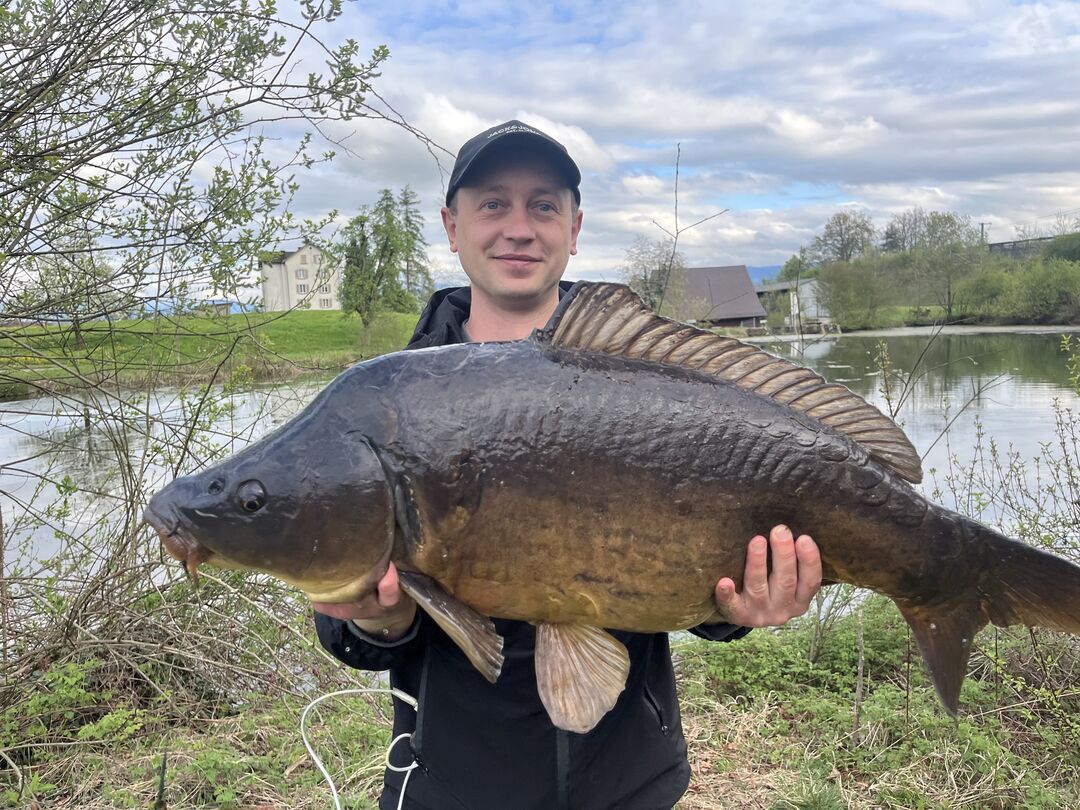 Aus Rüti erhalten wir folgenden Bericht von Dominik Thiel: «Als Pächter eines Weihers im Zürcher Oberland hatte ich am 18. April meinen Nachbarn aus der Ukraine, Vadym aus der Region Poltawa am Dnjepr, zum Fischen eingeladen. Am Morgen kein Biss. Am Abend versuchten wir es erneut, nach 40 Minuten neigte sich die Rute bei Vadym bis zum Bersten. Erst beim Feumern bemerkten wir die Grösse des Karpfens. Die Schuppenanalyse zeigte ein Alter zwischen 16 bis 18 Jahren!»