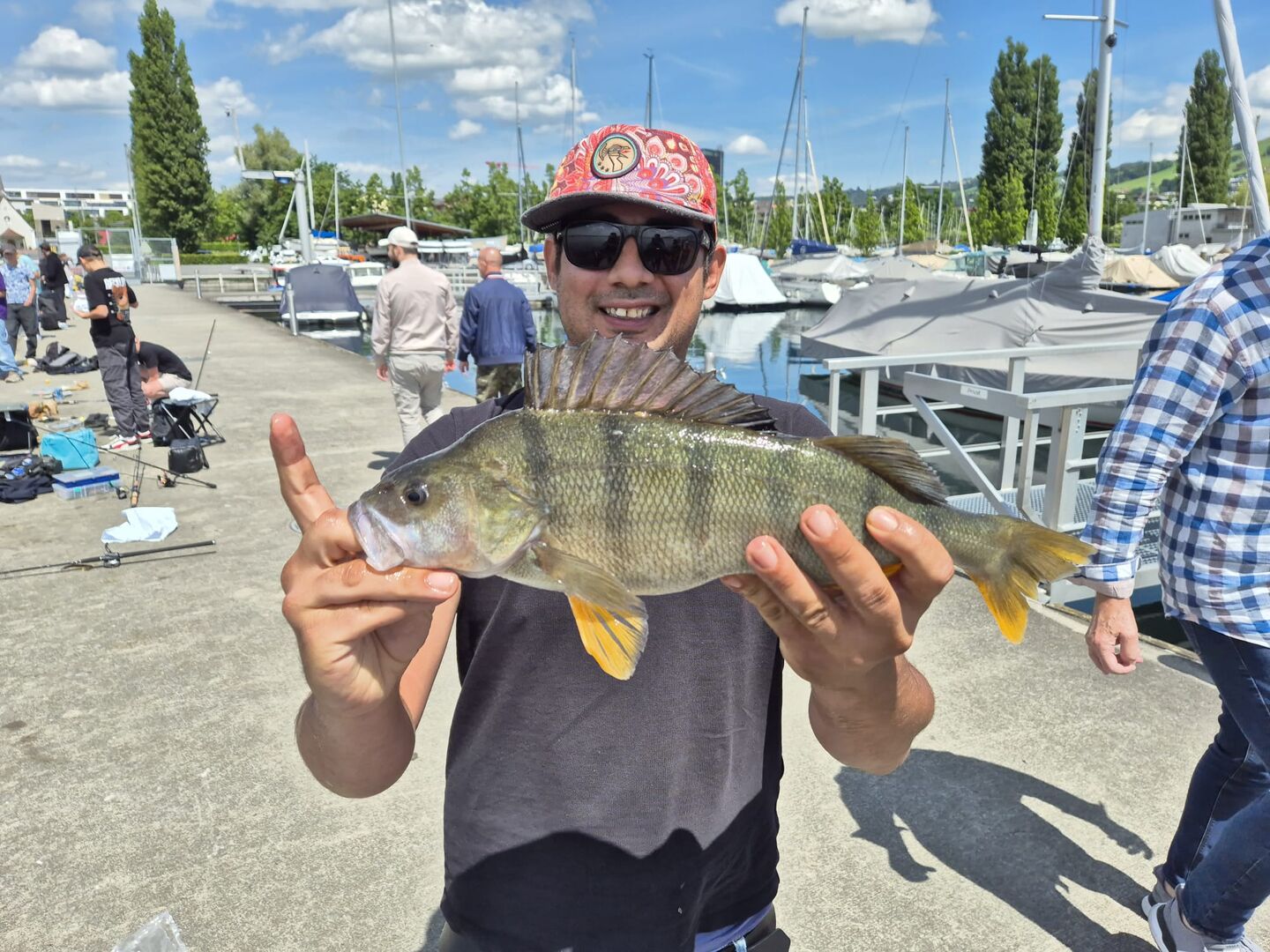 Ich fischte am 24. Mai mit meiner Hegene vom Land aus am Zugersee. Um 14.39 kam dann ein harter Biss. Ich dachte zuerst, es sei ein kleiner Hecht. Doch dann jubelte ich, als ich sah, dass es ein schöner Egli war.