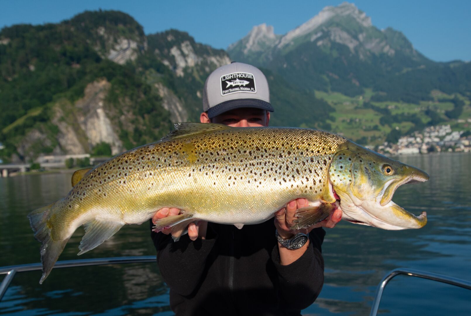Mein Kollege und ich waren am 19. Juni, einem heissen Frühsommertag, zeitig mit dem Boot unterwegs. Nach einer erfolglosen ersten Stunde steuerte ich eine Stelle mit stark abfallender Kante an, in der Hoffnung auf einen Hecht. Doch um etwa 7 Uhr schnappte sich völlig überraschend eine grosse Seeforelle meinen Hecht-Swimbait – wir trauten unseren Augen kaum! Der Fisch kam direkt ans Boot und schüttelte den massiven Kopf. Mit dem ausgeprägten Laichhaken sah er fast aus wie ein Lachs. Was für eine Prachtsforelle!