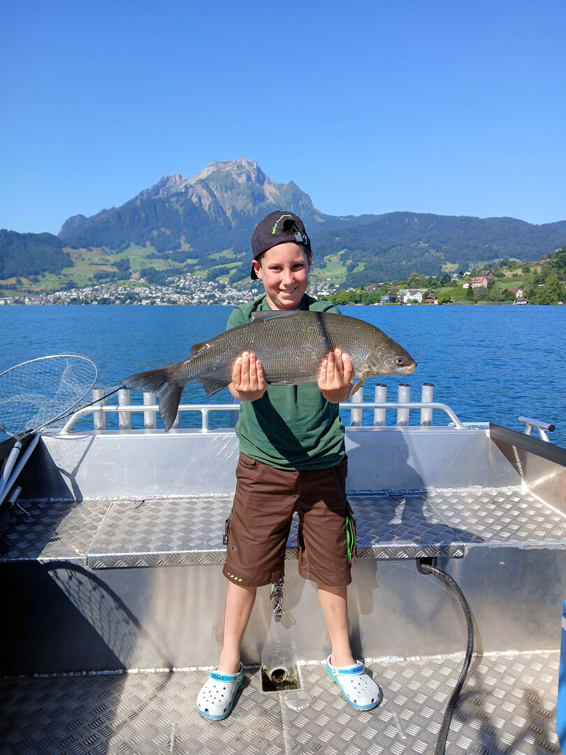 Ich fuhr am 11. Juli mit meinem Vater früh am Morgen bei schönem Wetter auf den See zum Felchenfischen. Schon nach kurzer Zeit hatte ich einen Biss und ich merkte, dass ich eine Grosse dran hatte. Der Fisch zog wie wild und ich musste die Bremse lösen. Mein Vater feumerte und ich war überglücklich über meinen grössten Fang bisher.