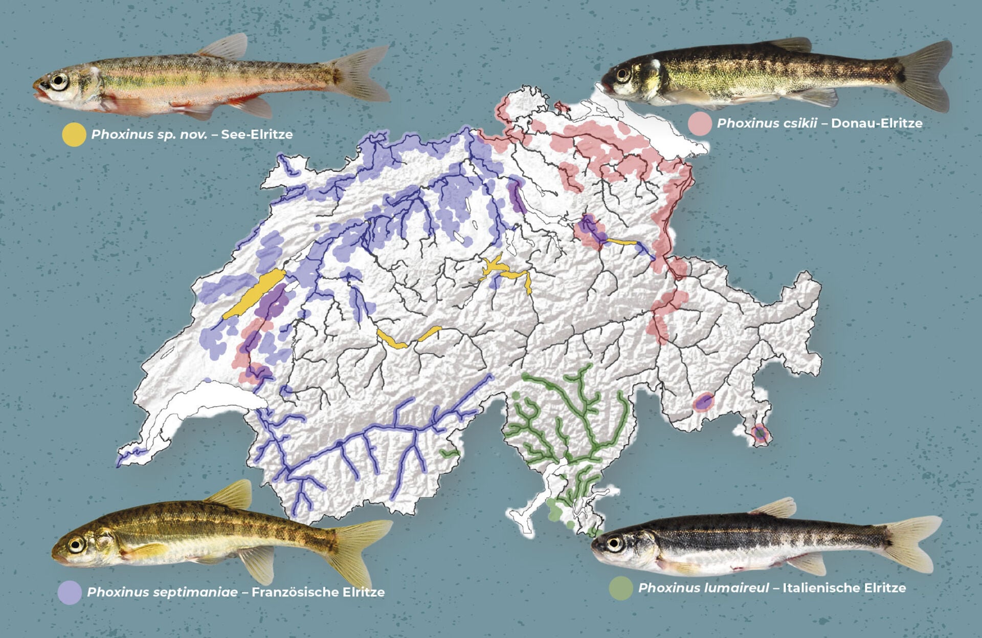 Die Verbreitungsgebiete der vier Elritzenarten sprenkeln die Schweizer Karte und überlappen sich. Noch unübersichtlicher ist die Situation in den Hunderten von Stau- und Bergseen, in denen Elritzen heute vorkommen. In ihnen wurden – teilweise seit Jahrhunderten – Fische unterschiedlichster Herkunft eingesetzt und wahrscheinlich auch weitere Arten.