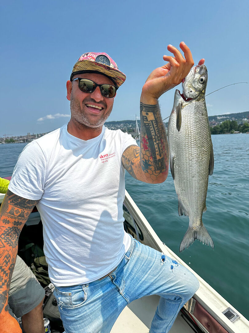 Am Pfingstmontag, 9. Juni, war ich mit meinen zwei Kollegen Marvin und Roli bei leicht bedecktem Himmel und einer Temperatur um die 22 Grad auf dem Zürichsee unterwegs. Unser Zielfisch war eigentlich der Egli. Nach langem Ausprobieren an mehreren Spots gaben wir auf und stellten auf die Felchenruten um. Wir steuerten einen Spot an, den wir bereits während der Eglisuche markiert hatten. Ich bestückte meine Rute mit einer 14er-Hegene in violetter Farbe. Auf dem Echolot sahen wir sehr gute Signale und sogleich hatte ein Kollege den ersten Fisch gehakt. Wenige Minuten später bekam ich meinen ersten Biss. Nach dem Anschlag war die Rute so krumm, als hätte ich einen Hänger. Die Kopfschläge und die Kraft dieses Fischs waren enorm und der Drill war spektakulär. Je näher die Felche an die Oberfläche kam, desto schwerer wurde sie. Was für ein Prachtsexemplar!