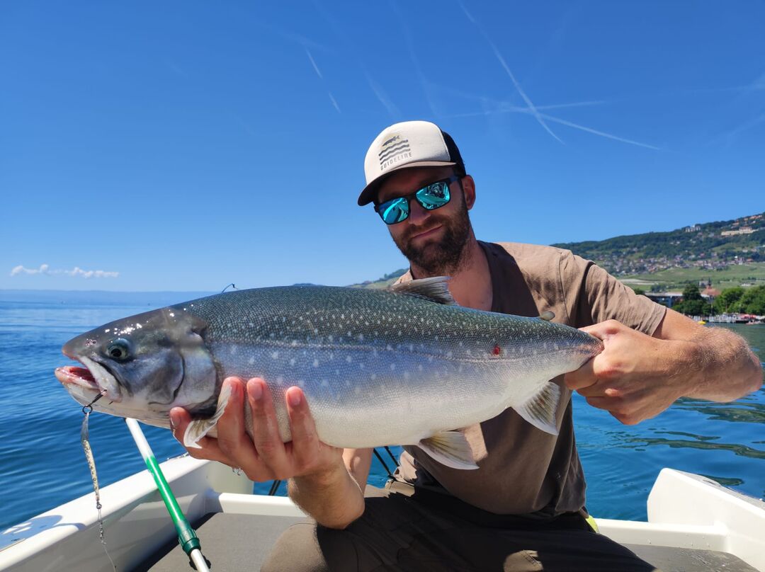 Am sonnigen Nachmittag des 30. Mai hatte ich das Glück, beim Schleppen vor Vevey diesen schönen Seesaibling aus dem Léman ziehen zu können. Er biss in 40 Meter Tiefe auf einen alten Blechlöffel an der Tiefseerolle.
