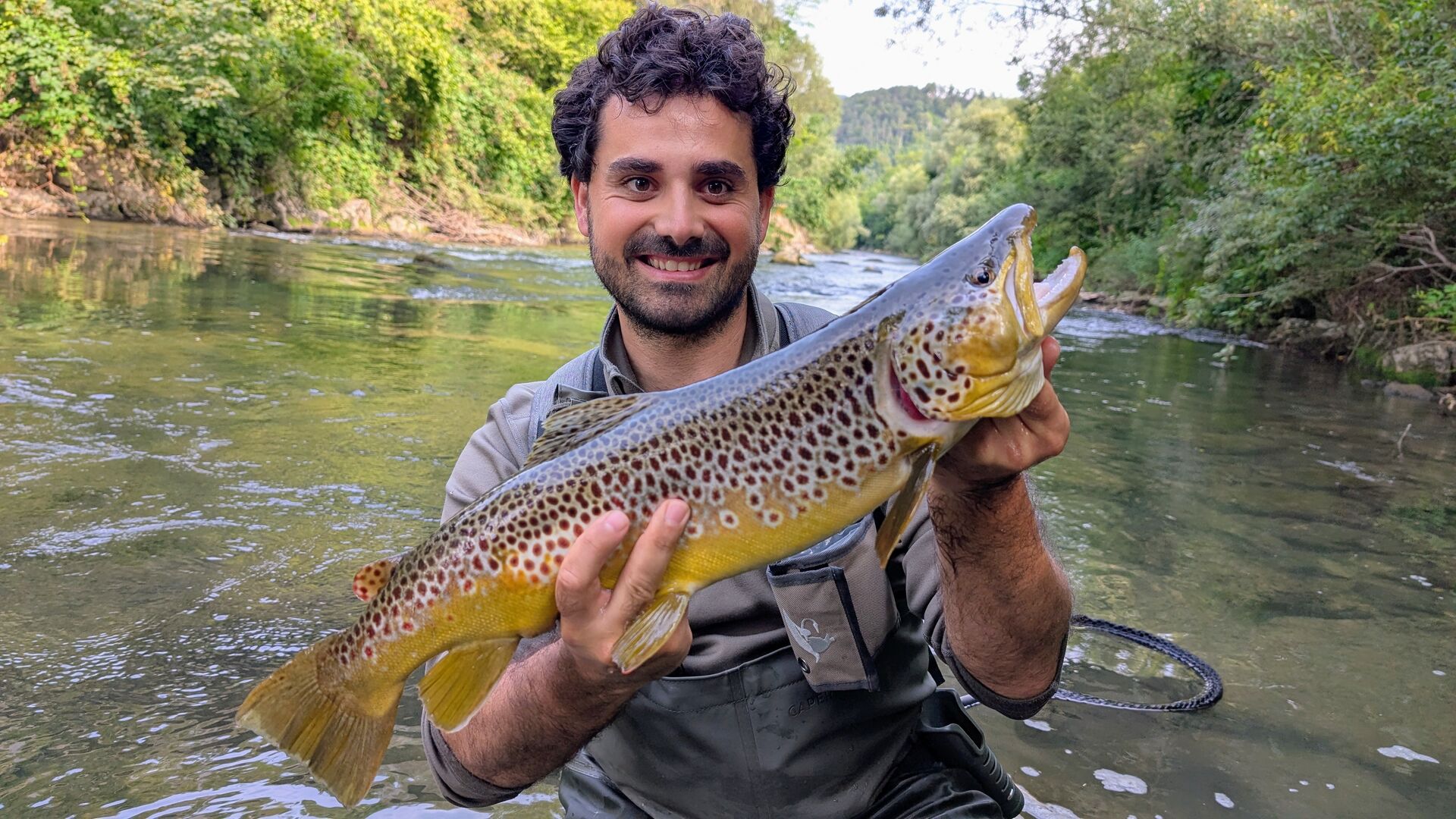 Am 6. August waren mein Anglerkollege und ich frühmorgens an der Birs unterwegs. Wir fischten in der Strömung, passierten einige vielversprechende Stellen, dann kam ein Biss mit Wucht auf meinen kupferfarbenen Spinner. Ich hielt dagegen und spürte sofort, dass diese Bachforelle ein grosses Exemplar sein musste. Ab da war ich nur noch auf den Drill fokussiert. Die Rollenbremse ratterte, die Rute bog sich und die gespannte Schnur zischte durch die Ringe. Zweimal schoss die Forelle in die Strömung zurück, bevor ich sie wieder unter Kontrolle brachte. Umso grösser war das Glücksgefühl, als wir diesen königlichen Milchner endlich landen konnten.