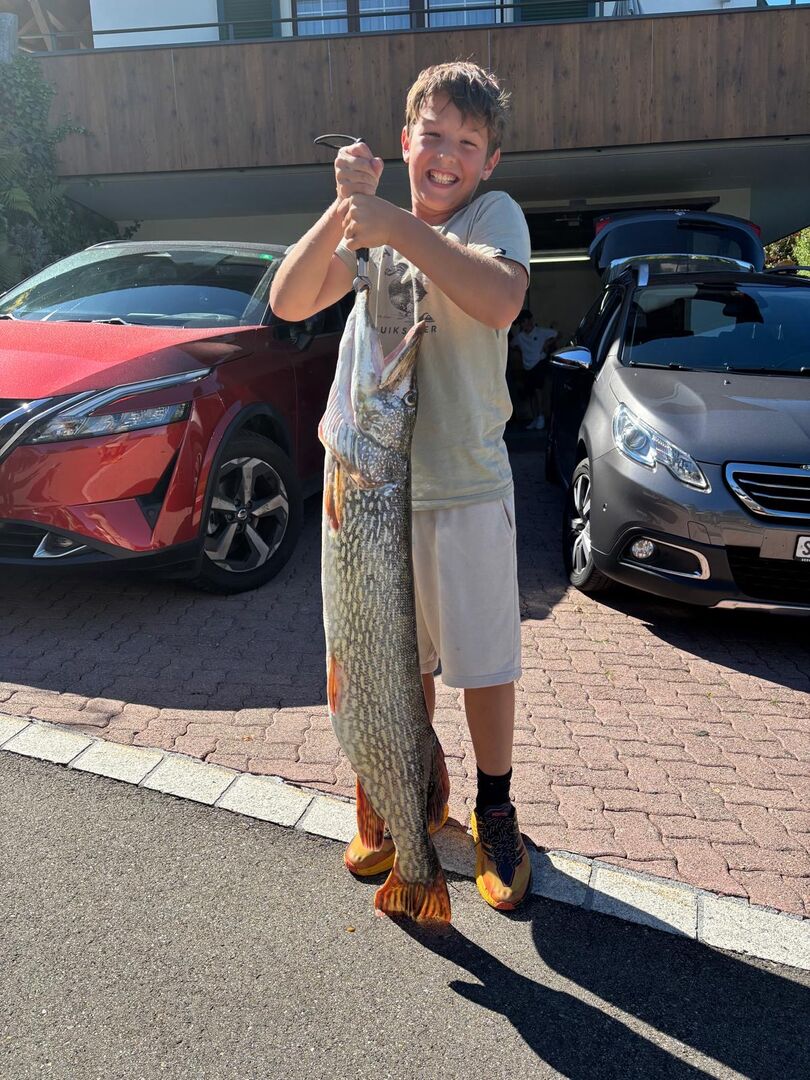 Elia Deck aus Wollerau durfte am 31. August auf dem Boot eines Aktiven am Zürichsee Wettfischen teilnehmen und selbst ausgewählte Gummifische an drei Zügeln am Unterwasserhund anbringen. Bei der Insel Ufenau auf der Höhe des Schiffsstegs in 22 Meter Tiefe dann ein heftiges Klingeln an der Rolle. Beim Heben der Zügel stellte Elia fest, dass der Hecht an einem seiner Zügel hing. Er befestigte den Zügel am Drillstock und begann den Hecht Richtung Boot zu ziehen. Trotz heftiger Gegenwehr landete er im Netz, wo ihn ein erschöpfter und stolzer Elia bewundern konnte. Sein bisher grösster Hecht in seiner noch jungen Fischerkarriere.