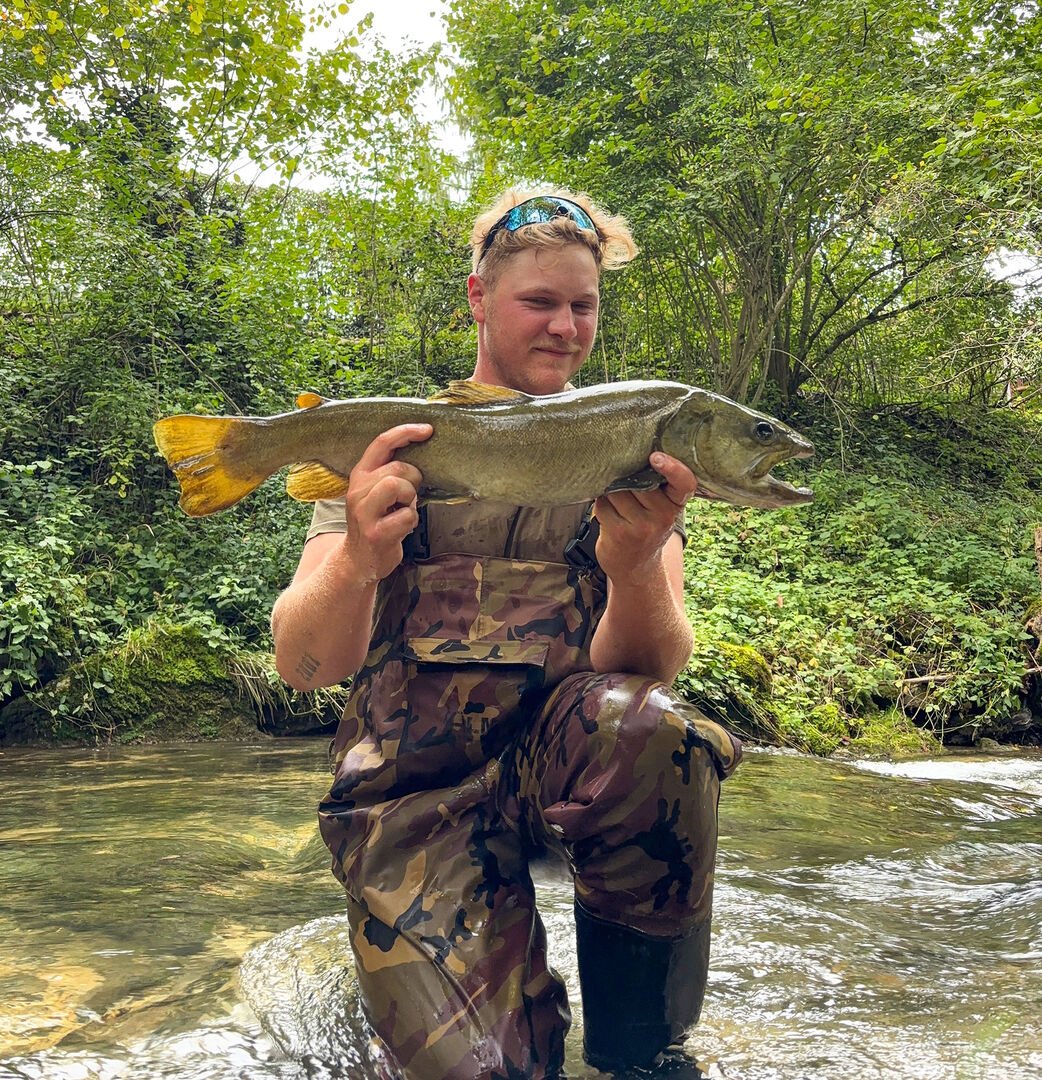 Am Sonntag, 14. September, ging ich wie immer an die Lützel in Kleinlützel zu meinem Lieblingsplatz. Durch das Hochwasser war ein Baumstamm angeschwemmt worden. Mit einem perfekten Wurf landete der Köder etwa zwei Meter hinter dem Stamm, kurz darauf kam der mächtige Biss und ein intensiver Drill folgte. Die Forelle hatte knapp im Feumer Platz. Die Freude war unbeschreiblich.